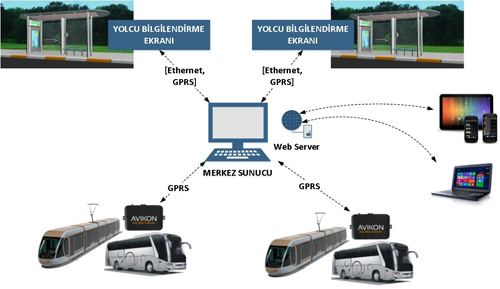 bağlı bir monitörde harita üzerinde sergilenmektedir. Kullanılan haritalar üzerinde araçların konumu, hızı, güzergahı, sonraki durak bilgileri, sonraki durağa olan mesafe, kalan süre, aracın sürücüsü gibi bilgiler anlık olarak görüntülenebilmektedir. Ayrıca, yazılımın ana sayfası üzerinden bu bilgiler kolayca değiştirilip, toplu taşıma organizasyonunun yapılmasına da olanak sağlanmaktadır.